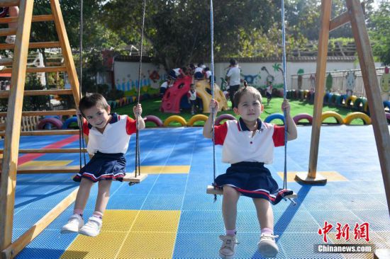 9月27日,新疆和田縣布扎克鄉庫木村幼兒園,小朋友在蕩秋千。當日,據該幼兒園園長維吾爾族姑娘阿爾孜古麗·阿力木介紹,該園由北京市援建,可容納300名學生,目前有14名教師。 中新社記者 李雪峰/文 中新社記者 田雨昊/攝