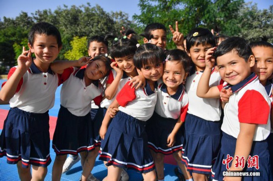 9月27日,新疆和田縣布扎克鄉庫木村幼兒園,小朋友在嬉戲玩耍。當日,據該幼兒園園長維吾爾族姑娘阿爾孜古麗·阿力木介紹,該園由北京市援建,可容納300名學生,目前有14名教師。 中新社記者 李雪峰/文 中新社記者 田雨昊/攝