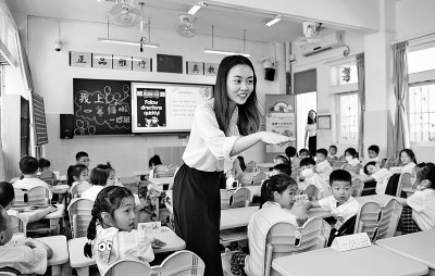 在廣東深圳市福田區南園小學,教師黃曉蕾在英語課上與孩子們互動。新華社發