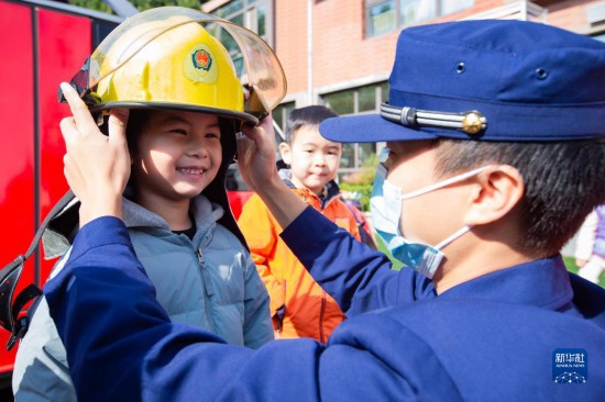 11月8日,在南京市雨花臺區宏圖上水幼兒園,小朋友在消防員的幫助下試戴消防頭盔。