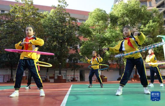 11月10日,衡陽市雁峰區環城南路小學的同學在玩呼啦圈。