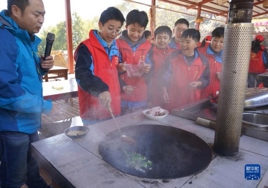 11月10日,在平利縣盛豐源現代農業勞動教育研學實踐基地內,平利縣城關初中8年級18班的同學在學習炒菜。