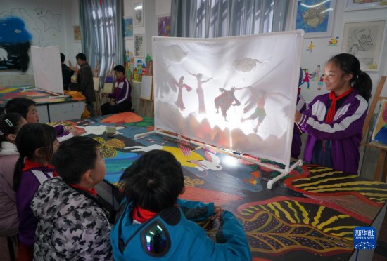 11月10日,平利縣城關第三小學6年級5班的學生在學校皮影室內排練皮影戲。