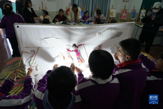 11月10日,平利縣城關第三小學6年級5班的學生在學校皮影室內排練皮影戲。