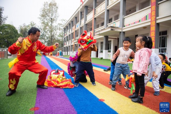 11月17日,在堯天坪鎮幼兒園,龍獅藝人文麥秋(左一)帶領學生練習舞獅動作。新華社記者 陳思汗 攝