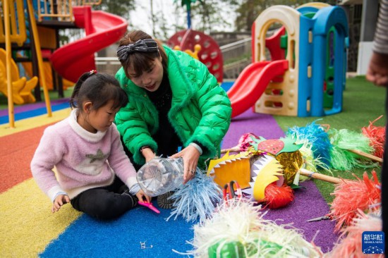 11月17日,在堯天坪鎮幼兒園,老師指導學生手工制作舞龍道具。新華社記者 陳思汗 攝