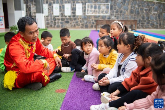 11月17日,在堯天坪鎮幼兒園,龍獅藝人文麥秋給學生上非遺課。新華社記者 陳思汗 攝