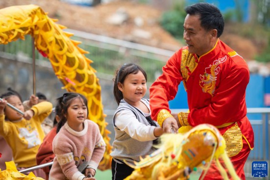 11月17日,在堯天坪鎮幼兒園,龍獅藝人文麥秋(右一)帶領學生練習舞龍。新華社記者 陳思汗 攝