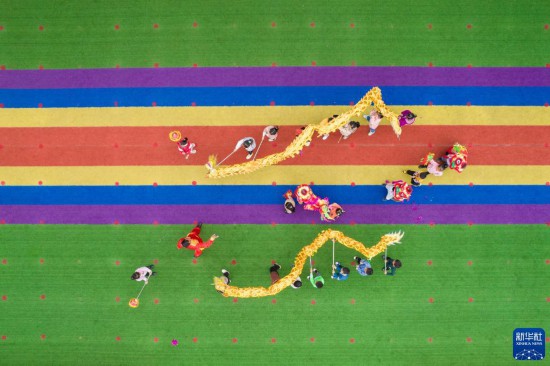 11月17日,在堯天坪鎮幼兒園,孩子們在龍獅藝人的帶領下進行龍獅訓練(無人機照片)。新華社記者 陳思汗 攝