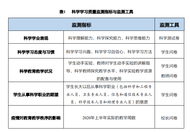 科學學習質量監測指標與監測工具。圖片來源:教育部基礎教育質量監測中心