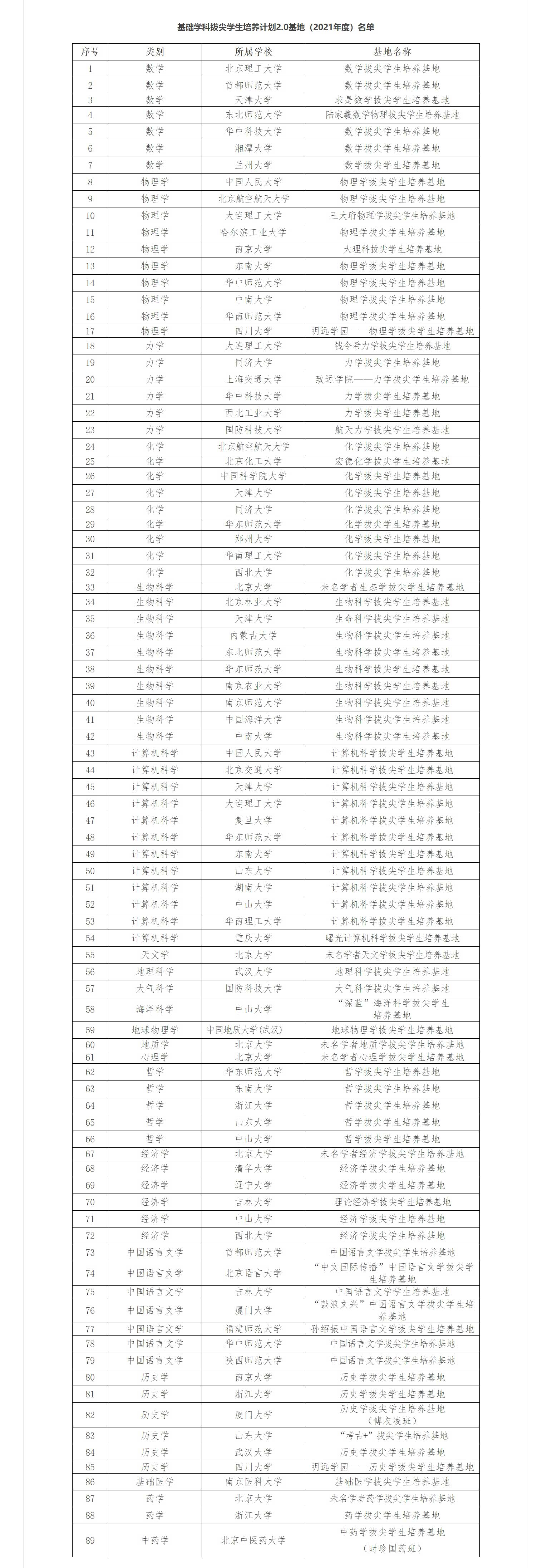 人民網北京11月30日電 (記者孫競)11月29日,教育部發布公告,在前兩批遴選建設199個基礎學科拔尖學生培養基地的基礎上,確定了基礎學科拔尖學生培養計劃2.0基地(2021年度)名單。