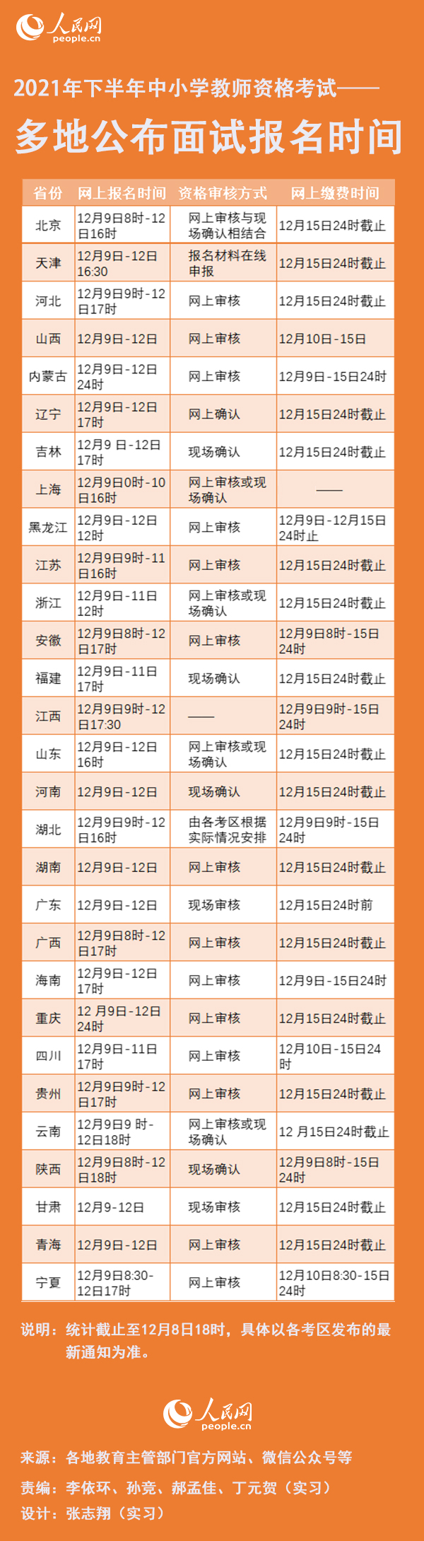 人民網北京12月8日電 記者從教育部考試中心獲悉,2021年下半年中小學教師資格考試(筆試)成績于今日正式發布,面試報名工作將于12月9日開始,面試日期為2022年1月8日至9日。此次面試在31個。ㄗ灾螀^、直轄市)舉辦,目前全國多地已正式發布面試報名公告,人民網對相關時間安排進行了梳理,以供考生參考。