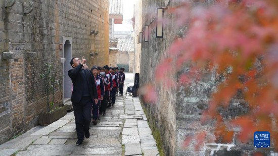 12月9日,在安義縣古村群景區,工作人員帶領學生參觀。