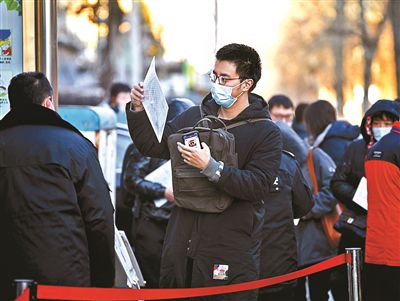 昨日,寒風呼嘯。不到8點,北京電氣工程學院的門外就已經有考生在等候。北京青年報記者看到,工作人員不停地喊話考生出示健康寶以及核酸檢測陰性報告,還緊盯著核酸報告的時間。據了解,本次考次考生必須帶齊準考證、本人有效居民身份證原件,經現場測量體溫正常、北京健康寶為“未見異!鼻页直救耸讏隹荚嚽48小時內采樣的核酸檢測陰性報告,方可進入考點。核酸檢測報告須為全國范圍內具有新冠肺炎病毒檢測資質的機構出具的紙質或電子報告,提供的報告上須準確顯示采樣時間,要精確到小時。