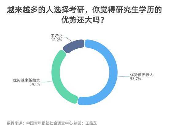 越來越多的人選擇考研,53.7%的受訪者覺得研究生學歷的優勢依舊很大,34.1%的受訪者覺得優勢越來越縮水,12.2%的受訪者表示不好說。