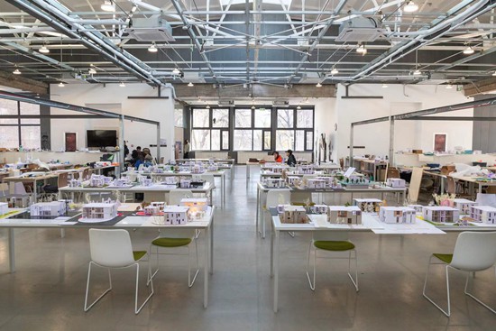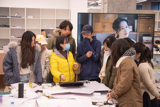 同學和老師圍坐在若干個長桌旁,有的畫圖、有的用工具打磨模型,還有的三五成群聽老師評圖……幾百個人在同一間教室思考幾百個不同的問題,絲毫不顯雜亂,各自井然有序。