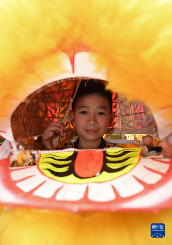 1月20日,在前童古鎮,13歲的“少年獅王”張鎮浩在練習間隙留影。