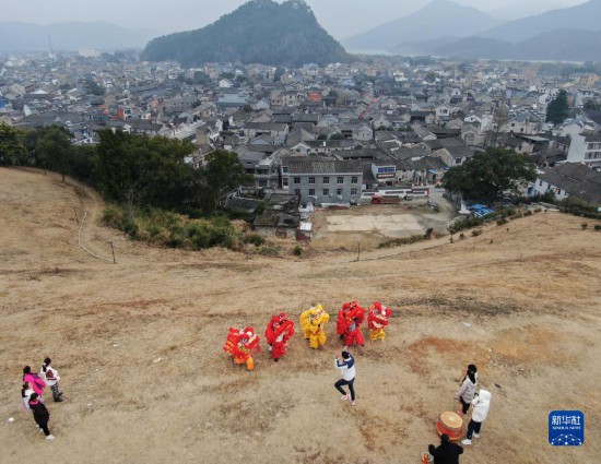 1月20日,在前童古鎮邊的小山上,童攀峰帶領舞獅隊進行訓練(無人機照片)。