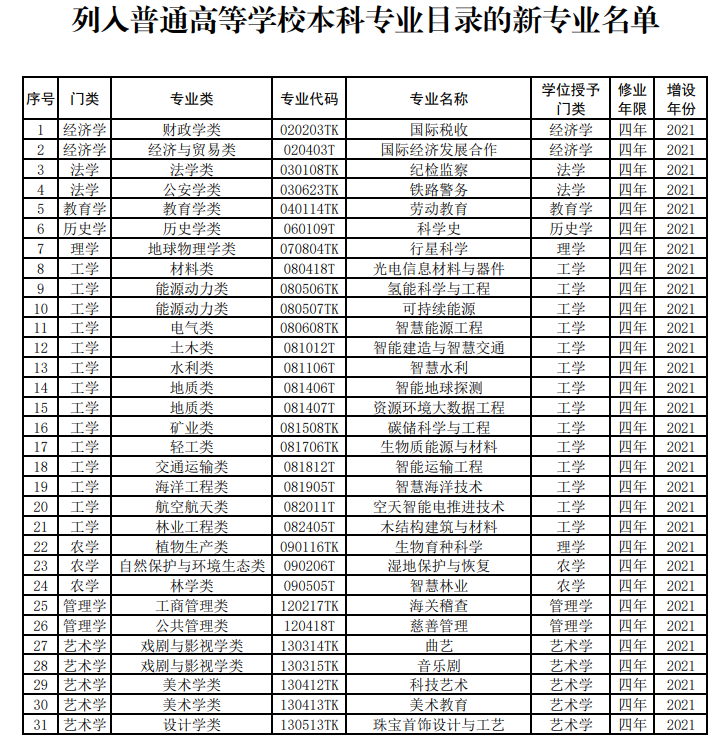 教育部公布2021年度高校新增和撤銷本科專業名單 31種新專業納入目錄