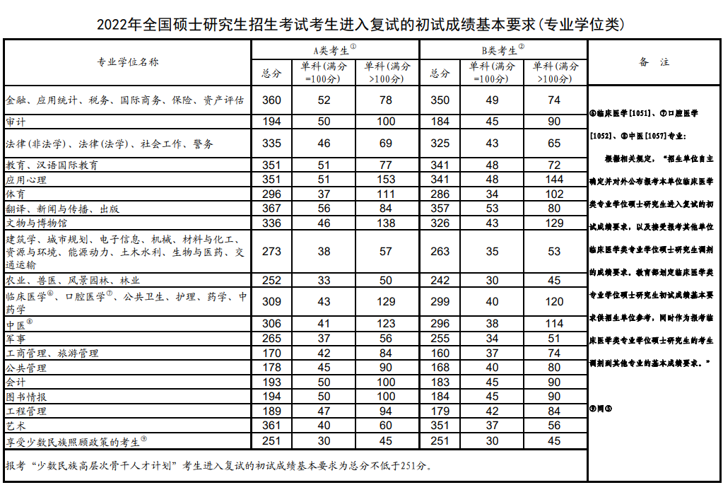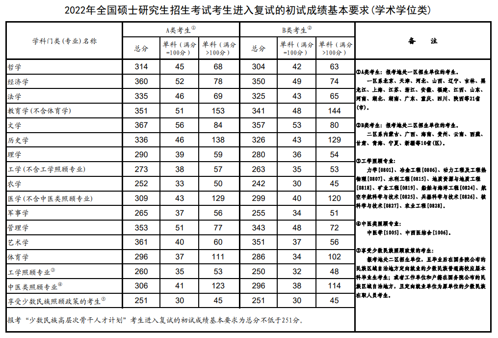 同日,教育部發布了《2022年全國碩士研究生招生考試考生進入復試的初試成績基本要求》(國家分數線)。各招生單位將根據《2022年全國碩士研究生招生工作管理規定》,在國家分數線的基礎上,自主確定并公布本單位各專業考生進入復試的要求。