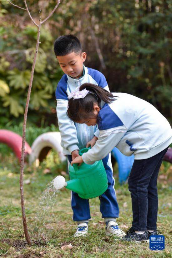 3月11日,在江蘇南京建鄴區金地名京幼兒園,小朋友給樹苗澆水。