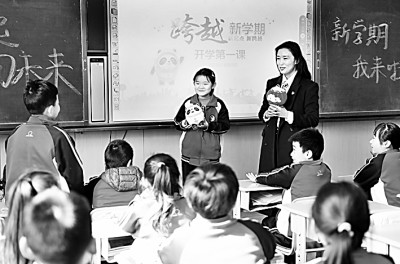 2月16日,山東青島中德生態園小學,老師和學生在開學第一課上交流冬奧的故事。新華社發