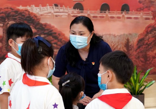 2021年9月3日,在中共一大紀念館內,上海市黃浦區盧灣一中心小學校長吳蓉瑾在鼓勵小小講解員。新華社記者 劉穎 攝