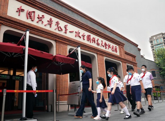 2021年9月3日,上海市黃浦區盧灣一中心小學校長吳蓉瑾帶著“紅喇叭”小小講解員等走進中共一大紀念館。新華社記者 劉穎 攝