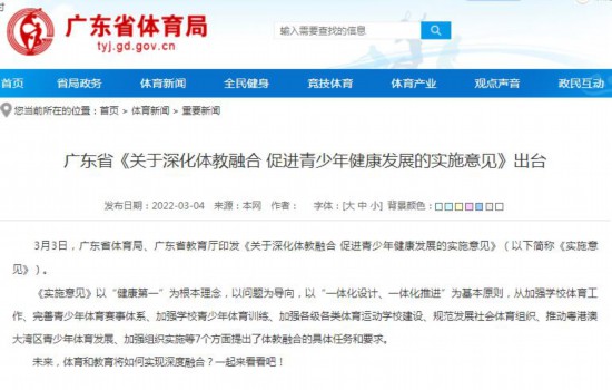 廣東省體育局副局長林瑛表示,早在2020年年底,體育和教育部門就聯合啟動了《意見》的編寫工作,經過12次研討會、專家組深入調研論證和向社會廣泛征求意見后最終成文。