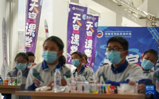 3月23日,在位于拉薩市的西藏自然科學博物館,學生代表收看航天員授課。