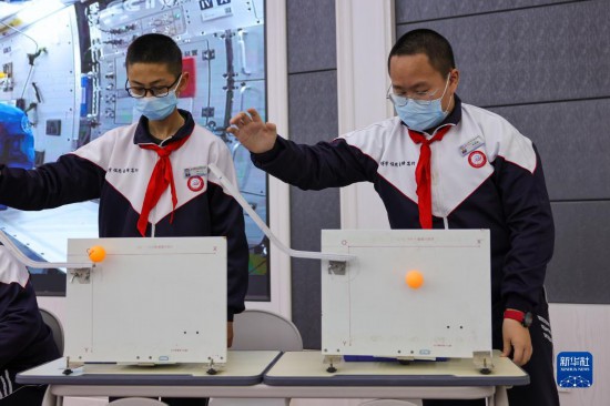 3月23日,在新疆烏魯木齊市第七十中學,學生收看“天宮課堂”第二課的同時進行拋物實驗。