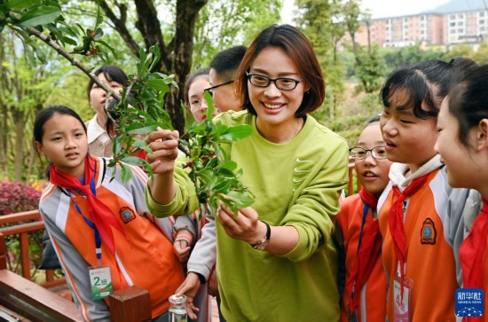 3月31日,陜西省級教學能手、嵐皋縣城關第二小學教師王曉君(中)帶領學生在巴山珍稀植物園開展實踐活動。