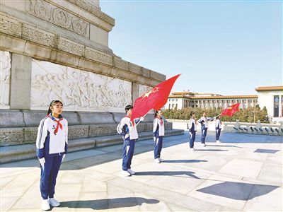 昨天上午,來自北京市京源學校的24名少先隊員來到天安門廣場,站立首都少年先鋒崗。