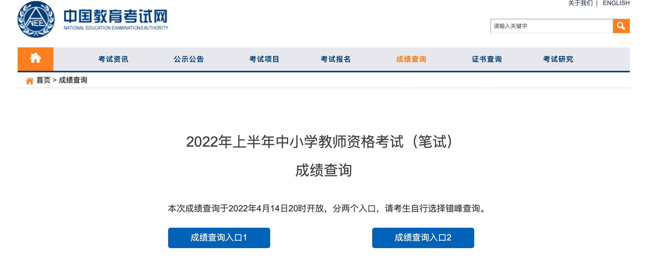 人民網北京4月14日電 (記者李依環、孫競)據教育部教育考試院網站消息,2022年上半年中小學教師資格考試(筆試)成績將于今天20時發布?忌鷮脮r可登陸中國教育考試網及其微信小程序等平臺查詢成績。