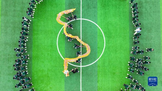 4月18日,湖南省常寧市源江學校學生在操場上練習舞龍(無人機照片)。