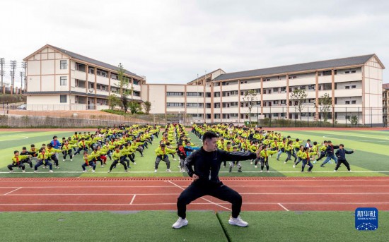 4月18日,貴州省黔西市錦繡學校學生進行武術操練習。