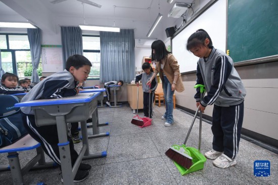 5月11日,湖州吳興區飛英街道月河小學一年級學生在老師的帶領下學習正確使用清掃工具。