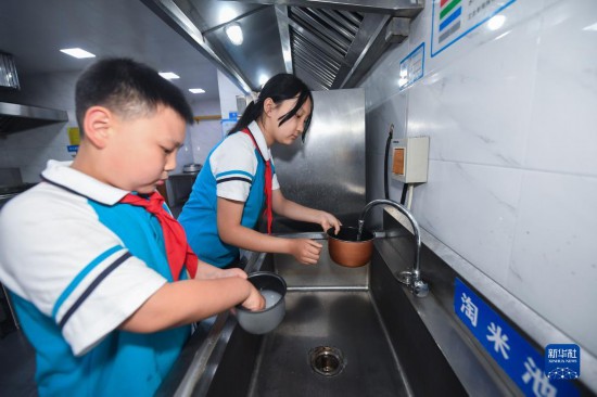 5月11日,湖州吳興區飛英街道月河小學六年級學生學習淘米煮飯。