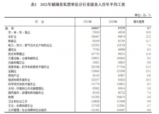 國家統計局數據顯示,2021年全國城鎮非私營單位就業人員年平均工資為106837元,首次超過10萬元,比上年增長9.7%,增速比2020年提高2.1個百分點,扣除價格因素實際增長8.6%