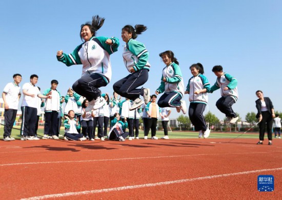 5月22日,青島通濟實驗學校高三學生在進行集體跳繩比賽。