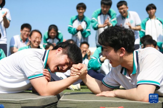 5月22日,青島通濟實驗學校高三學生在進行掰手腕比賽。