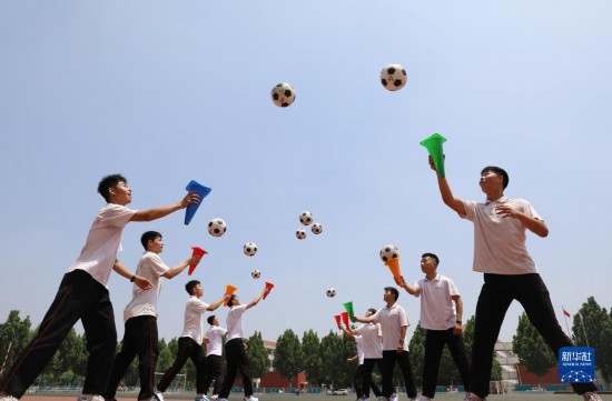 5月23日,焦作市溫縣一中高三學生在操場上做減壓游戲。