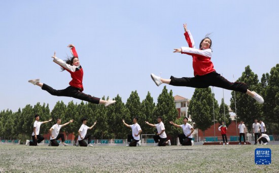 5月23日,焦作市溫縣一中高三學生在操場上做減壓游戲。