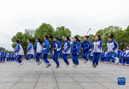 5月26日,貴州省岑鞏縣第一中學的高三學生在參加跳繩。
