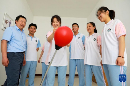 5月26日,安徽省淮北市第十二中學的心理輔導老師朱旭(左)帶領學生在校園心理健康輔導站宣泄室減壓。