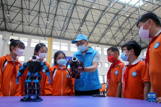 5月26日,科普志愿者為潁上縣第十六小學學生講解機器人編程知識。