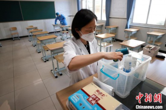走進考場內,校醫正在對課桌椅進行消殺。據介紹,在考試期間,每間考場都須在每一科目開考前開窗通風至少半小時,并在考試后進行徹底消殺。在考場里,同樣配備了免洗洗手液、消毒濕巾、口罩等防疫用品,以備不時之需。