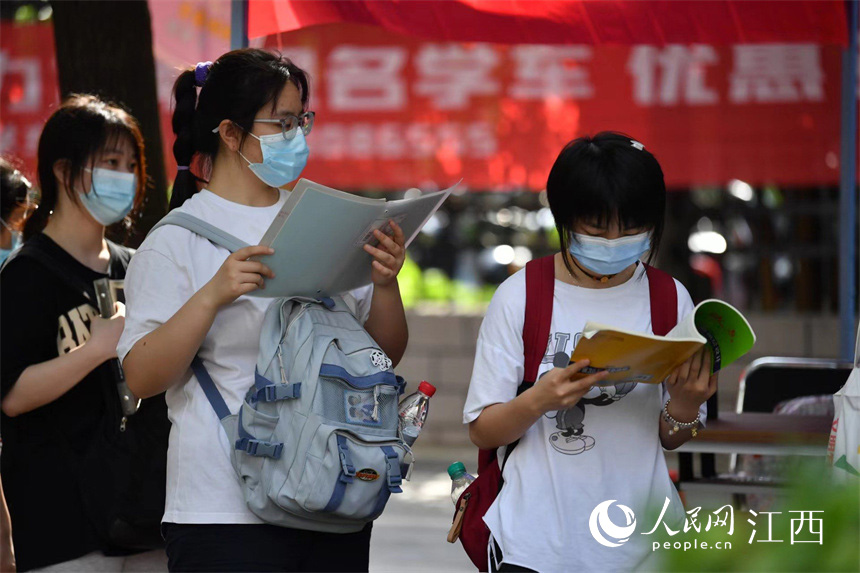 利用排隊的間隙,考生們抓緊時間復習。 人民網 時雨攝
