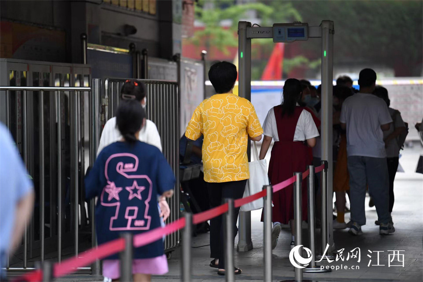 考生們經過安檢后進入考場。 人民網 時雨攝