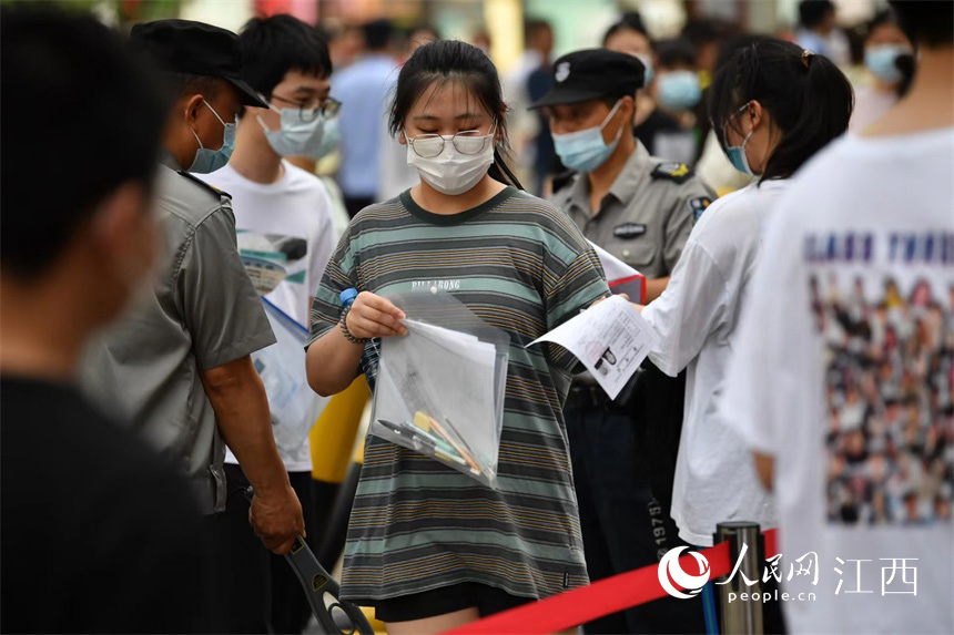 考生們經過安檢后進入考場。 人民網 時雨攝